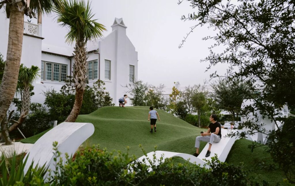 One example comes from Alys Beach on 30A in Florida. Fonville Park is a small playscape with low rolling hills covered in artificial grass with a few elements for sitting or climbing. The park includes public art in the form of sculptures of rabbits and carrots. To keep children from running off, the area is surrounded by landscaping with dense bushes and trees.