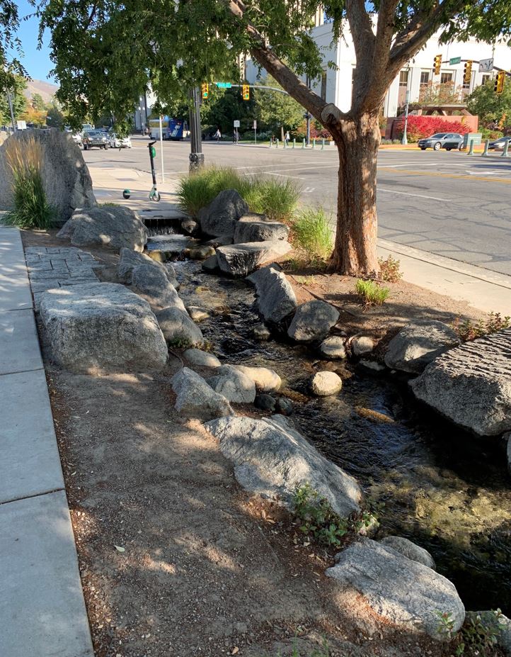 This involves creating a daylit stream above ground and rain gardens, or bioswales, with an intentional and attractive design—one that benefits plants and birds, acts as a natural filtration system, while preventing the heavy overflow of water from storms that tend to cause flooding in the street.