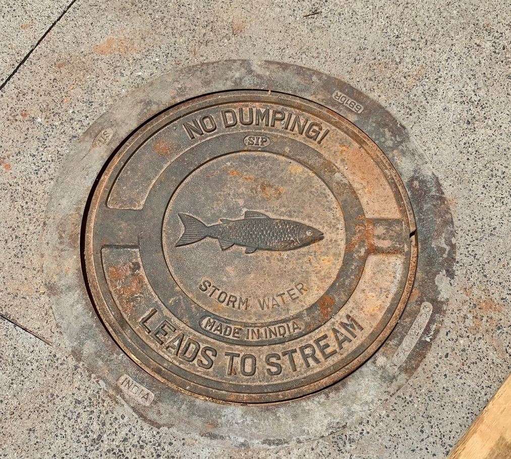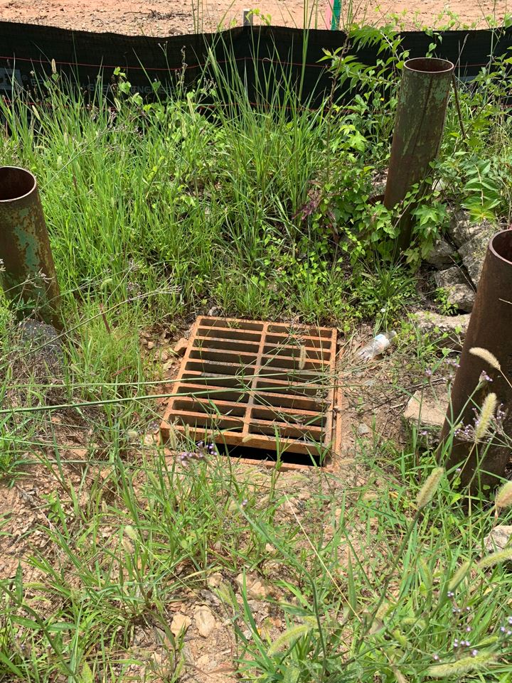 Newly installed manhole cover above storm drain in the alley next to the future town green.