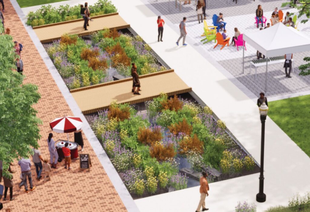 Conceptual rendering showing rainwater features on the proposed town green. Select this image for a larger view.